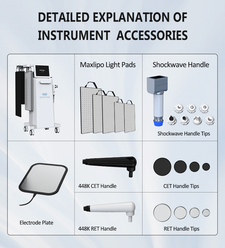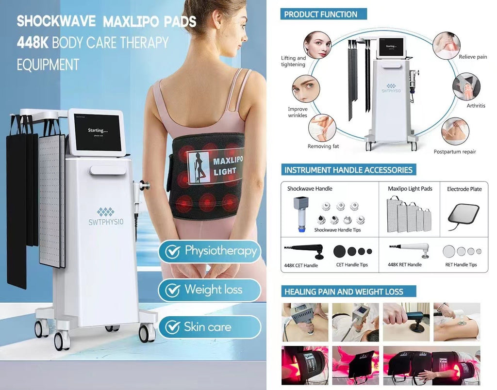 The SWTPHYSIO MaxLipo 448K is a 4-in-1 multifunctional body therapy system that integrates shockwave therapy, 448K CET/RET radiofrequency, and MaxLipo light pads. It is designed for body contouring, pain relief, rehabilitation, and skincare—making it an all-in-one solution for beauty clinics and physiotherapy centers.